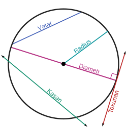 - Mərkəzdən keçən vətərə diametr deyilir və d hərfi ilə işarə olunur. Diametr çevrənin ən böyük vətəridir. Diametr 2 radiusun uzunluğuna bərabərdir (d=2r). Çevrənin sonsuz sayda diametri var. Hər diametr həm də çevrənin simmetriya oxudur.