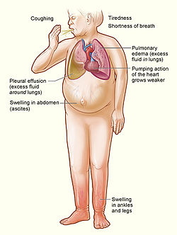 • Xroniki ürək çatışmazlığı isə bir aydan bir ilə qədər müddətdə inkişaf edərək və uzun sürür. Bu proses ləng və uzun sürdüyü üçün orqanizmin kompensator mexanizmləri ilə: ürək əzələsinin qalınlaşması, qan damarlarının daralması qan həcminin artması ilə xarakterizə olunur. Bu mərhələ kompensasiya olunan ürək çatışmazlığı adlanır. Sonradan orqanizmin rezerv qabiliyyəti tükəndikdən sonra dekompensasiya: ödem, dispnoe — təngnəfəslik mərhələsinə qədəm qoyur. Təginəfəslik əlaməti sakit vəziyyətdə və ya cüzi yükləmə zamanı özünü qabarıq şəkildə göstərir.