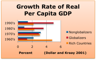 | 1980-ci ildən sonrakı dövrdə “qloballaşan” ölkələrdə adambaşına düşən ÜDM-in artımı 1960-cı illərdə ildə 1.4 faizdən və 1970-ci illərdə 2.9 faizdən 1980-ci illərdə 3.5 faizə və 1990-cı illərdə 5.0 faizə yüksəlib. Zəngin ölkələrdə artım tempinin 1960-cı illərdəki 4.7 faizdən 1990-cı illərdə 2.2 faizə enməsi fonunda bu sürətlənmə daha da diqqətəlayiqdir. Bundan əlavə, “qloballaşmayan” inkişaf etməkdə olan ölkələr “qloballaşan”lardan xeyli geridə qalıb – onların illik artım göstəriciləri 1970-ci illərdəki 3.3 faizdən 1990-cı illərdə cəmi 1.4 faizə düşüb. Bu sürətli artım yalnız Çin və Hindistanın güclü nəticələri ilə izah olunmur — 24 qloballaşan ölkənin 18-də artım əhəmiyyətli dərəcədə yüksəlib. |