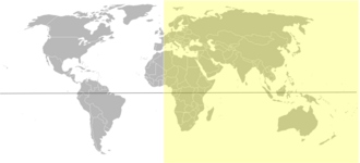 Şərq yarımkürəsində London şəhərindən şərqə tərəf Çukotka yarımadasının bir hissəsi olmaqla, Afrikanın böyük bir hissəsi, Hind okeanı, Avstraliya və Atlantik və