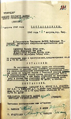 Xəlilova, Əsədullayeva, Məmmədova və Əliyevə Sovet rəhbərliyinə qarşı terror aktlarının hazırlanması ittihamının irəli sürülməsi qərarı. 8 avqust 1940-cı il.