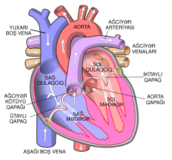 Açıq ürəyin ön görnüşü, ağ oxlar qanın cərəyan istiqamətini göstərir. Ağ ciyər kötüyü yuxarıda, sağda yerləşmişdir.