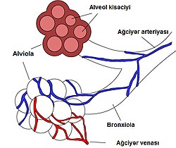 | Alveolun qurluş vahidi: alveola, alveol kisəciyi, bronxiola, ağciyər arteriya və venası | ||