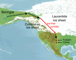 Buzsuz dəhlizin və xüsusi paleohindi məntəqələrinin təxmini yeri (Klovis nəzəriyyəsi)