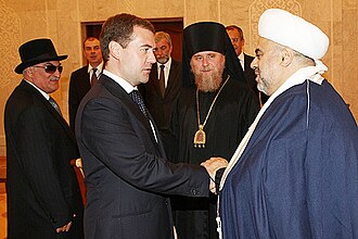 Allahşükür Paşazadə, Rusiya prezidenti Dmitri Medvedyev, Bakı Rus pravoslav kilsəsi yepiskopu Aleksandr və Azərbaycanın dağ yəhudiləri dini icmasının sədri Semyon İxiilov. Bakı, 3 iyul 2008