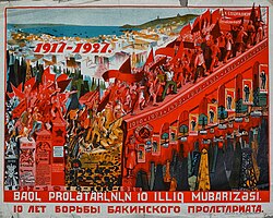 Azərbaycan və rus dillərində "Bakı proletariatının 10 illik mübarizəsi (1917–1927)" yazılı plakat. Pilləkənlərin üzərində "1920" rəqəmi, aşağıda "AzSSR" yazısı olan Qızıl Ordu əsgəri və gerb, altında isə "28/IV" tarixi yazılmışdır.