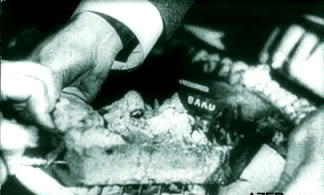 Hitler və alman zabitləri üzərində Xəzər dənizi və Bakı şəhəri təsvir edilmiş tortun ətrafında Üzərində Xəzər dənizi və Bakı təsvir edilmiş tort Üstündə Bakı şəhəri təsvir edilmiş Hitlerin yeməsi üçün kəsilən tort dilimi