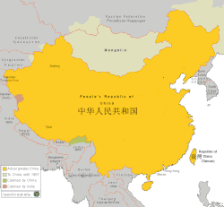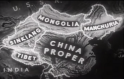 1944-cü ildə çəkilən ABŞ propaqanda filmi "Çin uğrunda döyüş"də təsvir olunan "Çin" xəritəsi. Burada Çin Respublkası olaraq kontinental Çin, Mançuriya, Monqolustan, Sincan və Tiber ərazilərini göstərilmişdir.