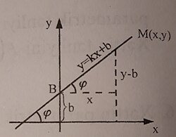 OX oxuna perpendikulyar olmayan hər hansı düz xəttin verilməsini fərz edək. Bu düz xəttin absis oxu ilə əmələ gətirdiyi bucaq φ, ordinat oxundan ayırdığı parça olsun. Düz xətt üzərində şəkildəki kimi ixtiyari M(x,y) nöqtəsi götürək. Bu zaman,