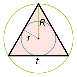 Xaricə çəkilmiş çevrənin radiusu daxilə çəkilmiş çevrənin radiusundan 2 dəfə böyükdür: R = 2 r {\displaystyle R=2r} {\displaystyle R=2r}