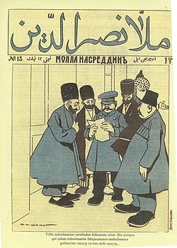 Molla Nəsrəddin jurnalının XIII buraxılışının üz qabığı. Fahişəlik haqqında ərizəni oxuyan kişilər.