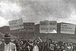 1988-ci il. Azərbaycanın Dağlıq Qarabağ bölgəsində baş qaldırmış erməni separatizminə etiraz əlaməti olaraq Göyçə mahalında gedən xalq etiraz mitinqlərindən biri