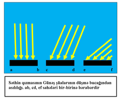 Yer səthi vahidinə düşən şüa enerjisinin miqdarı birinci növbədə şüanın düşmə bucağından asılıdır. Ekvatorda, orta və yüksək enliklərdə eyni bir sahəyə müxtəlif miqdarda radiasiya düşür. Bu asılılıq belə ifadə olunur: Günəş radiasiyasının intensivliyi şüanın düşmə bucağının sinusuna və ya yerin coğrafi enliyinin kosinusuna mütənasibdir: J 1 = J 0 s i n α =   J c o s φ {\displaystyle J_{1}=J_{0}sin\alpha =\ \mathrm {Jcos\varphi } } {\displaystyle J_{1}=J_{0}sin\alpha =\ \mathrm {Jcos\varphi } }