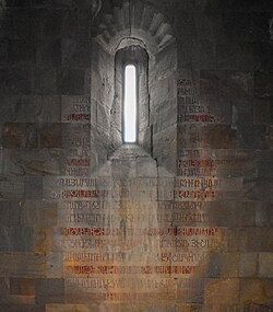 | Kitabənin sifarişçi və kilsənin ithafı ilə bağlı hissəsinin tərcüməsi: Müqəddəs Üçlüyün — Ata, Oğul və Müqəddəs ruhun adı ilə, mən, Tanrının xidmətçisi, Həsən Dövlə, Vaxtınqın oğlu, Böyük Həsənin nəvəsi, geniş əyalətləri ilə Xoxanaberdin çarı bu kitabəni yazmağı əmr etdim. Atam, ölümü və digər dünyaya köçməsindən əvvəl mənə və böyük knyaz Sərkisin qızı olan anam Xorişəyə, atalarımızın məzarı olan Gəncəsərdə bu kilsəni inşa etməyi vəsiyyət etdi ki, biz də inşaata erməni təqviminin 765-ci ilində Ruzi verənin köməkliyi ilə başladıq və şərq divarını pəncərəyə qədər inşa etdikdə dünyəvi həyatdan imtina edən anam üçüncü dəfə Yerusəlimə ziyarətə yola düşdü, orda rahibə köynəyi geyinərək illərlə Müqəddəs Qəbir kilsəsinin qapıları ağzında zahid həyatı sürərək vəfat etdi və orda da dəfn olundu. Biz isə həyatda qarşımıza çıxa biləcək bədbəxtlikləri yadda saxlayaraq inşaatı tamamlamağa çalışdıq və Rəhmli Rəbbin lütfü və xeyir-duası ilə onu 782-ci ildə tamamladıq. Səy və xoş niyyətimiz sayəsində müxtəlif formalar və rəsmlərlə bəzədilmiş kilsəyə mən, xaçlar, kitablar, müqəddəs əşyalar, zərif metallardan tökülmüş və qiymətli daşlarla bəzədilmiş müxtəlif məişət əşyaları verim. Bu kilsə, 789-cu ildə Alban Katolikosu ter-Nersesin hakimiyyəti dövründə ithaf edildi. | ![]() |