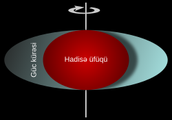 Dönən qara dəliyin ətrafındakı iki səth. İç sfera statik sərhəddir (hadisə üfüqü). Erqosferanın iç sərhədidir. Qütblərdə hadisə üfüqünə toxunan oval formada səth isə erqosferanın digər sərhədidir. Erqosferanın içindəki bir zərrəcik fəza-zaman dreyfində olub dönməyə məcbur edilir (Penrouz müddəti).
