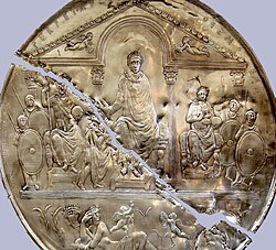 Üzərində sağında Arkadi, solunda Honori və arvadının qardaşı II Valentinian həkk olunmuş ailə yubiley boşqabı, surət.