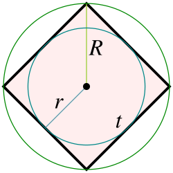 - Tutaq ki, kvadratın tərəfi , xaricinə çəkilmiş çevrənin radiusu , daxilinə çəkilmiş çevrənin radiusu isə -dir.