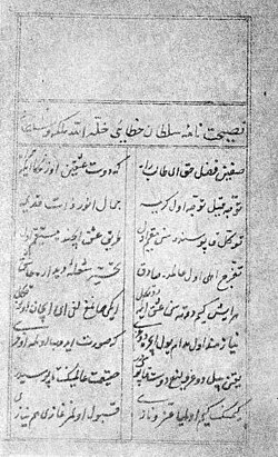 | Yazı | Ərəb qrafikalı Azərbaycan əlifbası Latın qrafikası Latın qrafikalı müasir Azərbaycan əlifbası ilə qarışdırılmamalıdır.(Avropalılar tərəfindən) |