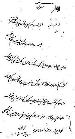 Emīr-i aʿẓam-i ekrem Mūsā Dūghurt ʿināyat u şefqatımız ümidvār olundun sonra şöyle bilsün kim iftihār-i aʿāzım u aʿyān Aḥmed Āghā Qaramānlu ol tarafa gönderdük ve ol hər nə ki iḫtiyār ilə kəndünə şefqat etsün gerek kim müşārileyh sözündən u maslaḥatdan çıkmasun ve mutābaʿat u yārdam unga qılsun kim inşāʾallāh taʿālā hər nə kim etmək murādi u istəyi olsa hāsıl olur. Gündən güne hər iş vāqeʿ olsa Aḥmed Āghā ittifāqı ilə dergāh-ı maʿlāmıza bildirsünlər kim hər növ buyruğumuz olsa ʿamal etsin. Könlümüzə xoş dutub mərḥametimizə əmr-dār olsun.