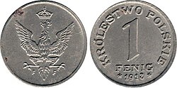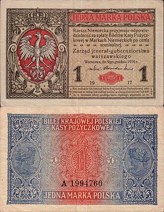 1917-ci ildə 1⁄2, 1, 2, 5, 10, 20, 50, 100 və 1000 marka dəyərində banknotlar və 5, 10 və 20 feninq dəyərində sikkələr buraxıldı. 1918-ci ildə 1, 5, 10 və 20 feninq dəyərində sikkələr buraxıldı. Hər sikkənin üzərində "F" (Ştutqart) zərbxana işarəsi qeyd olunurdu. 1918-ci ildə müstəqilliyin elan edilməsi ilə Polşa markası dövriyyədə qaldı və Polşa Xəzinəsinin Emissiya Ofisi tərəfindən daha müstəqil dövlətin pul vahidi olaraq buraxıldı.