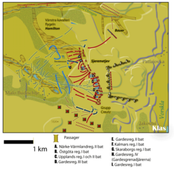 Qarşısında qoyulmuş məqsədə doğru general Roos redutların birinə həmlə etdi, lakin bu olduqca uğursuz alındı və o əsgərlərinin az qala yarısını itirdi. Menşikovun diviziyasındakı süvarilərə komandanlıq edən rus genaralı Ransel bundan yararlandı. Roosun dəstəsi məhv edildi, qalanlarını Ransel əsir götürdü.