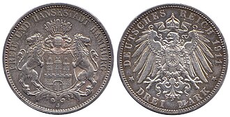 Hamburq şəhərində 1911-ci ildə zərb edilən aid 3 marka