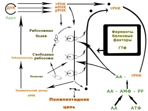 Protein amin turşusu ardıcıllığı haqqında məlumat mRNT-da yer alır. Üç ardıcıl nukleotid (kodon) bir amin turşusuna uyğundur. Eukariotik hüceyrələrdə, köçürülmüş mRNT öncəsi və ya pre-mRNT yetkin mRNT meydana gətirmək üçün işlənir. Emal,kodlanmayan protein ardıcıllığının (intronların) çıxarılmasını əhatə edir. Bundan sonra mRNT nüvədən sitoplazmaya ixrac olunur,burada amin turşuları ilə əlaqəli Nəqliyyat RNT (nRNT)-ləri istifadə edərək mRNT-ni çevirən ribosomlar bağlanır.