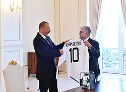 Tahir Gözəl Azərbaycan Prezidenti İlham Əliyevə Qarabağ FK futbol formasını təqdim edir.