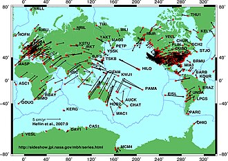 Plitələrin hərəkəti NASA JPL 2011-07-21 at the Wayback Machine peyklərindən alınan GPS məlumatlar əsasında çıxarılıb. Vektorlar hərəkətin istiqamətini və həcmini göstərir.