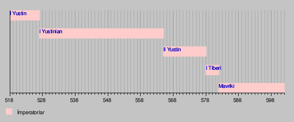 I Yusinin hökmranlıq dövrü 518–527-ci illərə təsadüf edir. Onu Böyük I Yustinian (527–565) əvəz etmiş, ondan sonra isə hakimiyyətə Kiçik II Yustinian (565–578) gəlmişdir. Ağıldankəm və sonsuz II Yustinian frakiyalı qvardiya başçısı Tiberi oğulluğa götürərək onu sezar elan edir. I Tiberidən sonra səltənətə onun qızının əri Mavriki (582–602) hökmdarlıq edir.