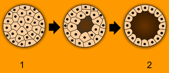 Animals are unique in having the ball of cells of the early embryo (1) develop into a hollow ball or blastula (2).