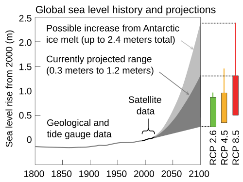 2017-ci ildə ABŞ Qlobal Dəyişiklik Təbqiqatı Proqramı tərəfindən dərc olunan, 2010-cu ilə qədər olan tarixi dəniz səviyyəsi rekonstruksiyası və proyeksiyaları