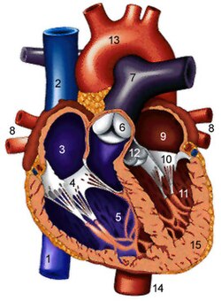 1.yuxarı boş vena – (lat. vena cava superior), 2.aşağı boş vena – (lat. vena cava inferior), 3. Sağ qulaqcıq – (lat. Atrium dextrum), 4.üçtaylı qapaq – (lat. valva atrioventricularis dextra s. tricuspidalis (valvula tricuspidalis – BNA)), 5. Sağ mədəcik – (lat. Ventriculus dexter), 6.ağciyər kötüyü qapağı – (lat. valva trunci pulmonalis (valvulae semilunares arteriae pulmonalis – BNA)), 7.ağciyər kötüyü (lat. truncus pulmonalis), 8.sol yuxarı və aşağı ağciyər venaları – (lat. vv. pulmonales superior et inferior sinistrae), 9. Sol qulaqcıq – (lat. Atrium sinistrum), 10.ikitaylı qapaq – (lat. valva atrioventricularis sinistra s. mitralis (valvula bicuspidalis – BNA)), 11.Sol mədəcik – (lat. Ventriculus sinister), 12.aorta qapağı – (lat. valva aortae (valvulae semilunares aortae – BNA)), 13.Aorta qövsü – (lat. Arcus aortae), 14.Aorta – (lat. Aortae), 15. Ürəyin zirvəsi – (lat. Apex cordis)