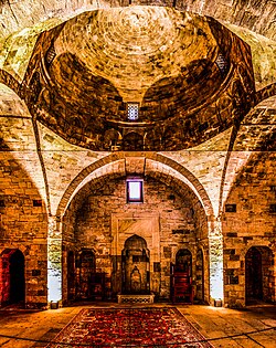 İbadət salonunun mərkəzi hissəsi daş günbəzlə, yanları isə tağtavanla örtülmüşdür. Əsas günbəz bu tağtavanlara və pilonların künclərinə söykənir. Məscid binasının əsas oxu cənub istiqamətindədir. Giriş qapısı ilə üzbəüz divarda yerləşmiş mehrab da cənuba baxır. Yaxın Şərq ölkələrinin məscidlərinin çoxunda mehrabın bədii tərtibatına xüsusi fikir verilsə də, burada mehrab çox sadədir.