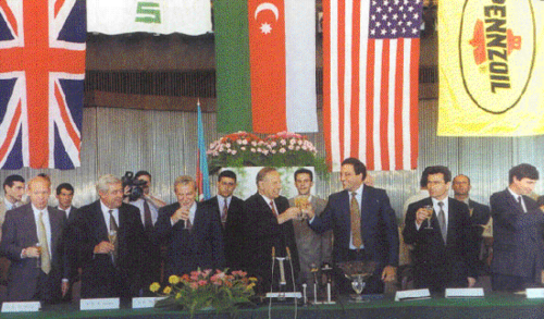 1994-cü il sentyabrın 20-də Bakıda Gülüstan sarayında Xəzərin Azərbaycan sektorundakı Azəri–Çıraq–Günəşli yataqlarının dərin su qatlarındakı neftin birgə işlənməsi haqqında dəyəri 7,4 mlrd. dollar olan "məhsulun pay bölgüsü" tipli müqavilə imzalandı. Müqavilə öz tarixi, siyasi və beynəlxalq əhəmiyyətinə görə "Əsrin müqaviləsi" adlanmış, təxminən 400 səhifə həcmində və 4 dildə öz əksini tapmışdır. Müqavilənin 13 milyard ABŞ dolları həcmində qiymətləndirilməsi onun nə üçün "Əsrin müqaviləsi" adlandırılması sualına verilən cavablardan biri ola bilər. "Əsrin müqaviləsi"ndə dünyanın 8 ölkəsinin (Azərbaycan, ABŞ, Böyük Britaniya, Rusiya, Türkiyə, Norveç, Yaponiya və Səudiyyə Ərəbistanı) 13 ən məşhur neft şirkəti (SOCAR, Amoco, BP, McDermott, UNOCAL, Lukoyl, Statoil, Exxon, Türkiyə Petrolları, Pennzoyl, ITOCHU, Ramco, Delta) iştirak etmişdir. Bu müqavilədə Böyük Britaniyanın "British Petroleum" (qoyulacaq investisiyanın 17,12 faizi) və "Ramco" (2,08 faizi), ABŞ-nin "Amoco" (17,01 faiz), "UNOCAL" (11,2 faiz), "Pennzoil" (9,81 faiz), "McDermott" (2,45 faiz), Rusiyanın "Lukoil" (10,0 faiz), Norveçin "Statoil" (8,56 faiz), Türkiyənin "Türkiyə Petrolları" .şirkətinin (1,75 faiz) və Azərbaycan Neft Şirkətinin isə 20 faiz payı var idi. Bununla da "Yeni neft strategiyası" və doktrinası uğurla həyata keçirilməyə başlandı.